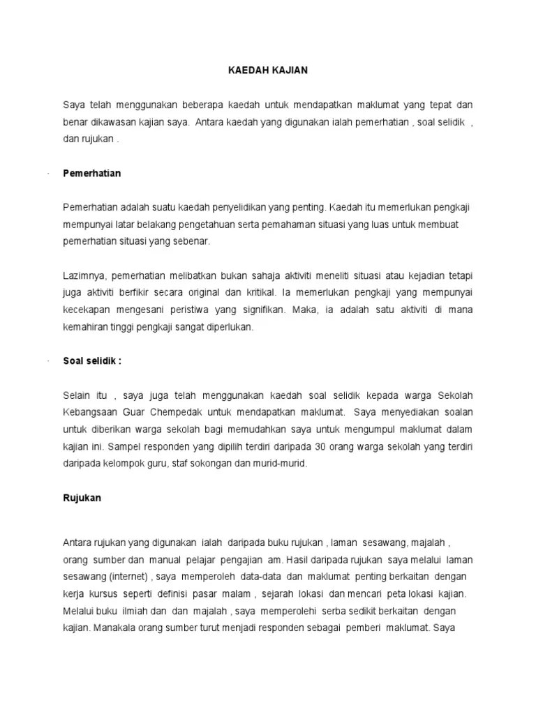 Selain itu, maksud lain metodologi ialah kaedah, jalan, teknik,gaya,ragam,rentak,corak dan sistem. 6.2 kaedah kajian dan demografi responden. Temu bual semi struktur format terletakdi antara temu bual berstruktur dan tidak berstruktur. Data kualitatif ialah dalam bentuk temubual, pemerhatian, dan analisis dokumen. Itu, kaedah kajian yang dirangka adalah melibatkan reka bentuk kajian, subjek atau sampel kajian, prosedur kajian, prosedur pengambilan data serta prosedur penganalisisan data. Hal ini dikatakan demikian kerana metodologi kajian merujuk kepada kaedah yang paling sesuai untuk menjalankan penyelidikan dan menentukan tatacara yang efektif bagi menjawap perasalahan kajian. Jan 01, 2012 · penyelidikan kualitatif mempunyai bentuk data yang tersendiri yang berbeza dengan penyelidikan kuantitatif. •dapat mengelakkan salah tafsir dan salah anggap. •penemubual boleh menerangkan dengan jelas maksud soalan atau kajian. 3 kaedah temubual (samb.) 3.2 mengapa temubual dianggap cara terbaik untuk kumpul maklumat? Sindrom down berlaku adalah disebabkan oleh keadaan kromosom yang abnormal. Berdasarkan kajian, risiko melahirkan anak sindrom down menjadi tinggi dilahirkan oleh ibu yang berumur 35 tahun ke atas.